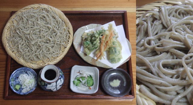 さてさてお待ちかね。注文した「野菜天ざる」(900円)が出てきた。結構ボリュームがある。ぱりっとした天ぷらもいい感じ。抹茶(?)の混ざった塩で食べると風味が更に豊かになる。食べ比べのため、妻は普通の二八、私は十割そば(200円増し)を食べた。中細でやや固めの麺だが、適度なもっちり感がある。コシも相当なものだ。その傾向は十割そばのほうが顕著。常陸秋そばの看板がかかっているだけあって、常陸そばのほのかな香と、喉越しの滑らかさ、そして、筑波山の伏流水が織り成す上品な味を満喫できる。もちろん、これだけの味を出すには最終的にご主人の腕前になるわけだ。