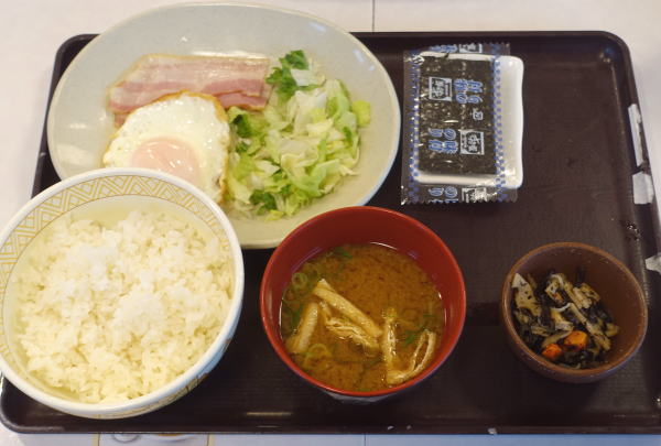 早朝、朝食にどうしても目玉焼きが食べたかったので、国道沿いのすき家へ。
