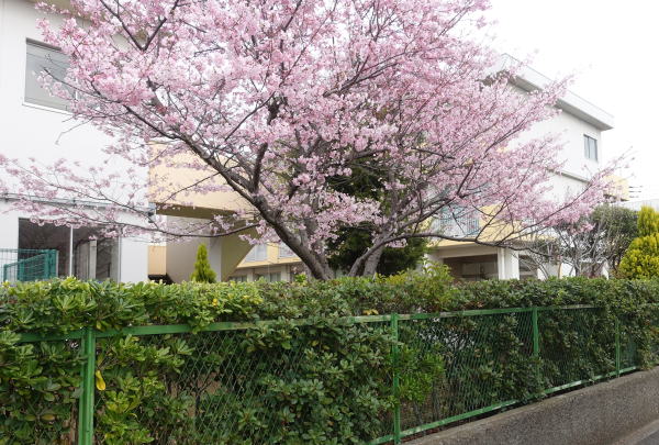 サブエントランスを出てお向かいさんの桜が8分咲き。