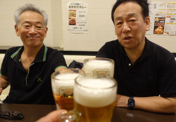 現地のイートインのスペースで乾杯。