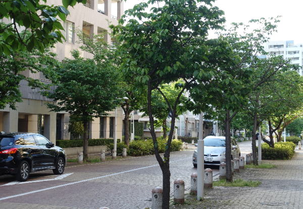 桜の木には小さなまだ緑のさくらんぼがなっている。
