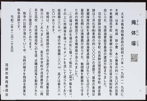 突貫工事もさることながら、約150戸の民家や寺社、小学校が強制移転を命じられたということや、茂原海軍航空基地の建設には中学校や農学校、高校の生徒、および近隣住民も動員されていたそうで、当時の大変さが感じとれる。