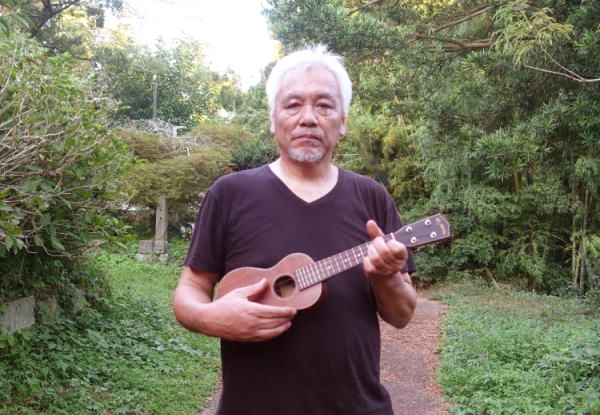 ショックはショックだけど、汗びっしょりになって、これから風呂(君津の森)に行く前にウクレレで自ら癒しているところ。つうか自撮り。(笑)