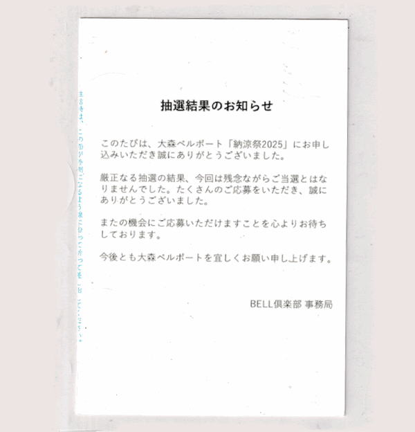 往復はがきで申し込んだんだけど、未だに通知が来ないってことはハズレたんだろうか。