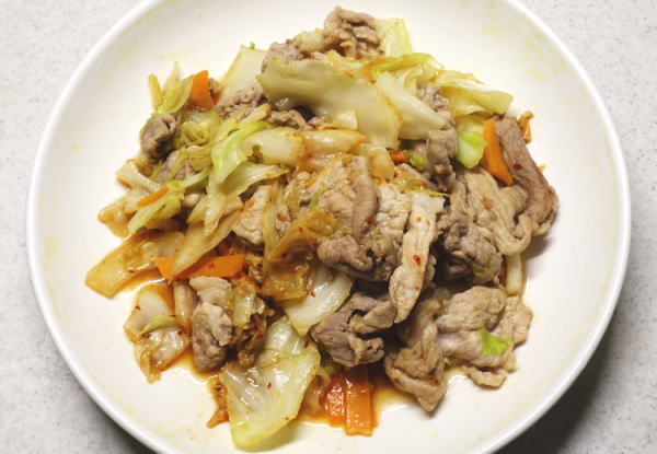 豚肉とキャベツ主体の野菜炒めだけど、豆板醤も入れてピリ辛にしたので、回鍋肉っぽいと自画自賛。