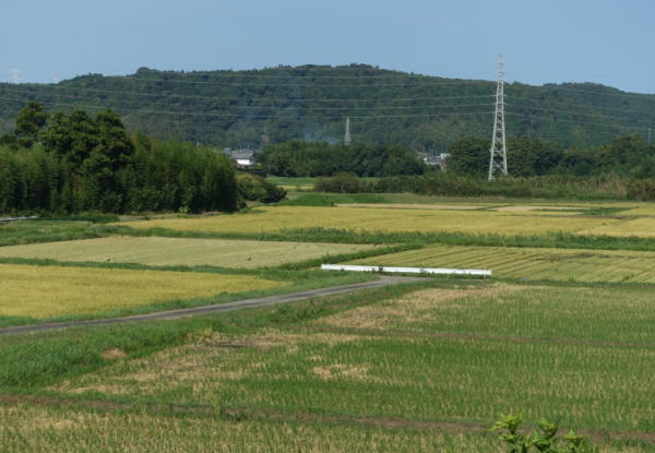 左のほうから山を越え、木更津市馬来田経由で小櫃の草刈りの現場へ向かう。