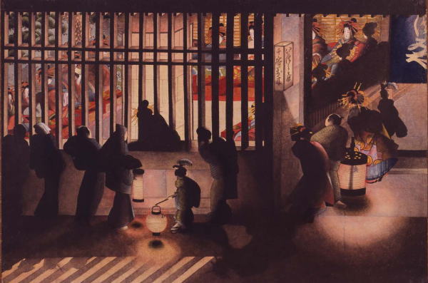 葛飾応為の代表作である「吉原格子先之図」は、江戸時代の遊廓である吉原の夜景を、光と影の対比を巧みに用いて幻想的に描き出した肉筆浮世絵です。提灯の明かりに照らされた人々の姿や、妓楼の格子の中の明るい世界が対比的に描かれ、西洋絵画のような陰影表現が特徴です。画中には応為を示す隠し落款も記されており、現在は太田記念美術館が所蔵・展示しています。