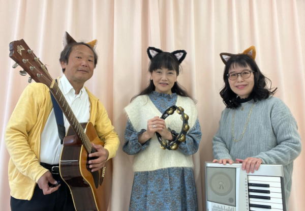 ギターやキーボードを弾きながら3人でハモリをいれて歌います。
