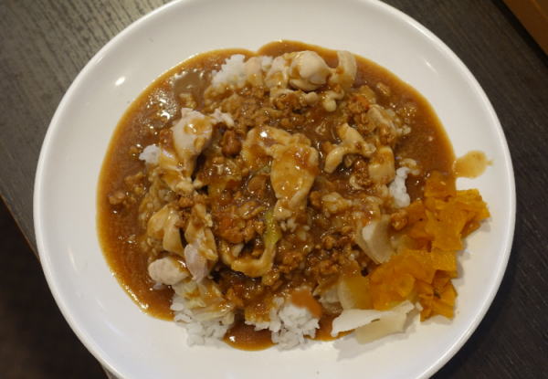 写真は元々入っている豚(?)のひき肉にしゃぶっとさせた鶏肉を乗せた合い肉カレーライス。