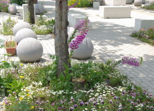 右:美浜打瀬小学校から近いベイタウン・コアの中庭にはシロツメグサが咲いていた。