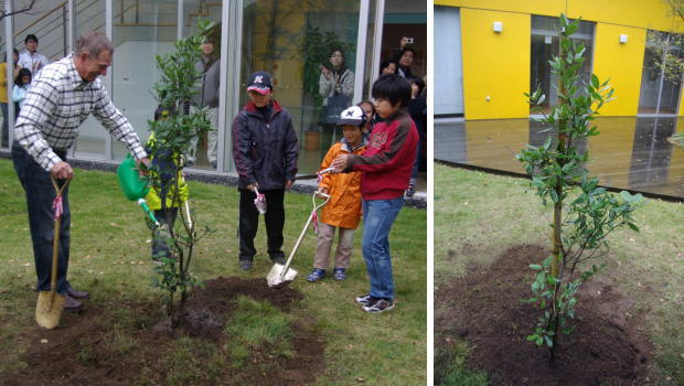 雨のそぼ降る中、千葉ロッテマリーンズのボビー・バレンタイン監督による植樹のセレモニーが行われた。場所はベイタウン・コアの中庭。中央がバレンタイン監督。いわゆるお手植え(?)の後の記念撮影である。ご覧のようにたくさんの人が集まった。こちらから見て、監督の左側、マー君との間に、ひょろひょろっと植わっているのが、そのお手植えの月桂樹である。元気に育つといいね。