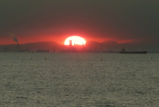 一旦雲に隠れた太陽だったが、横浜の辺りに沈む時にまたちらりと顔を出す。
