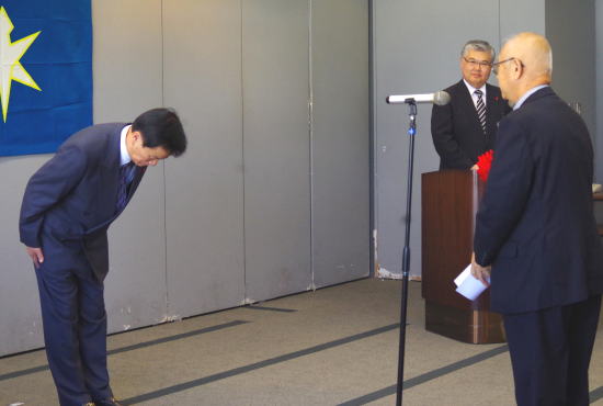 山根理事長の謝辞に、深々と低頭する森田知事。